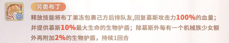 技 能——另类布丁:释放技能将布丁果冻包裹己方后排队友,回复慕斯攻击力100%的血量;并提供慕斯10%最大生命的生物护盾;除慕斯外每有一个机械族少女额外再附加2%的生物护盾,持续1回合