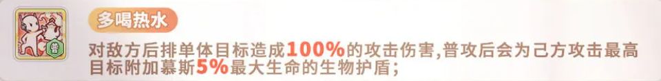 普通攻击——多喝热水:对敌方后排单体目标造成100%的攻击伤害,普攻后会为己方攻击最高目标附加慕斯5%最大生命的生物护盾;