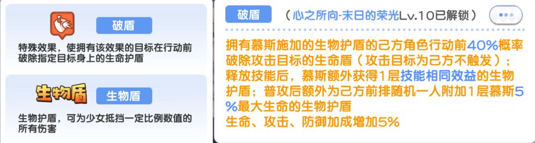 1、拥有慕斯施加的生物护盾的己方角色行动前40%概率破除攻击目标的生命盾(攻击目标为己方不触发)