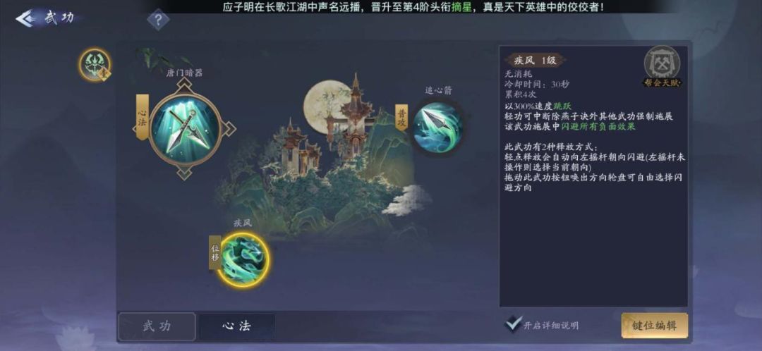 除了绝技,战斗轻功和普通攻击外,玩家可以从6个主动技能中选择4个放置在玩家的操作轮中,所以玩家需要对于自身的流派武功有一定的了解,每个武功是师门标签效果,需要的时候,可以在武功界面的左下角,选择键位编辑功能,来装备和替换武功。