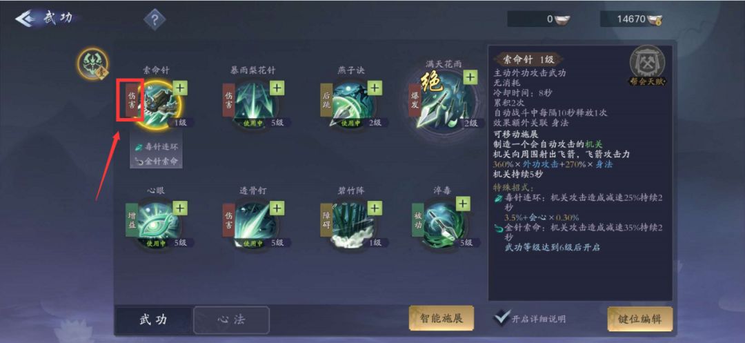 每个武功属于什么类型,会在武功上有2个字的简要描述,比如“减速”“治疗”等等,这两个字可以说明这个武功的基础作用,方便玩家了解武功。