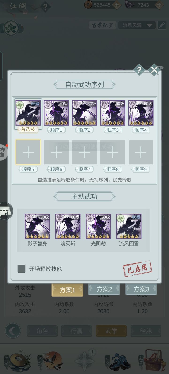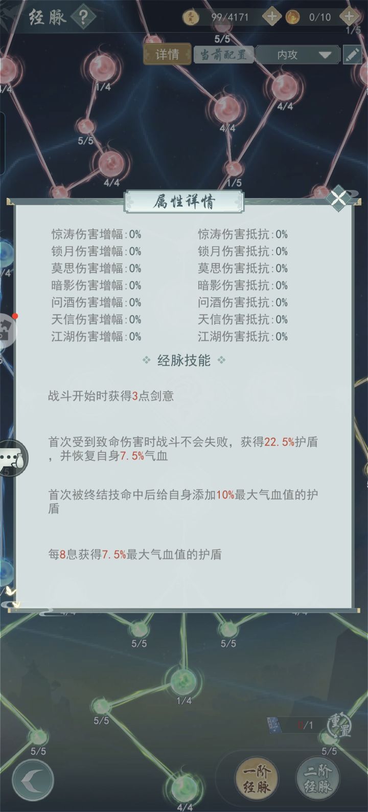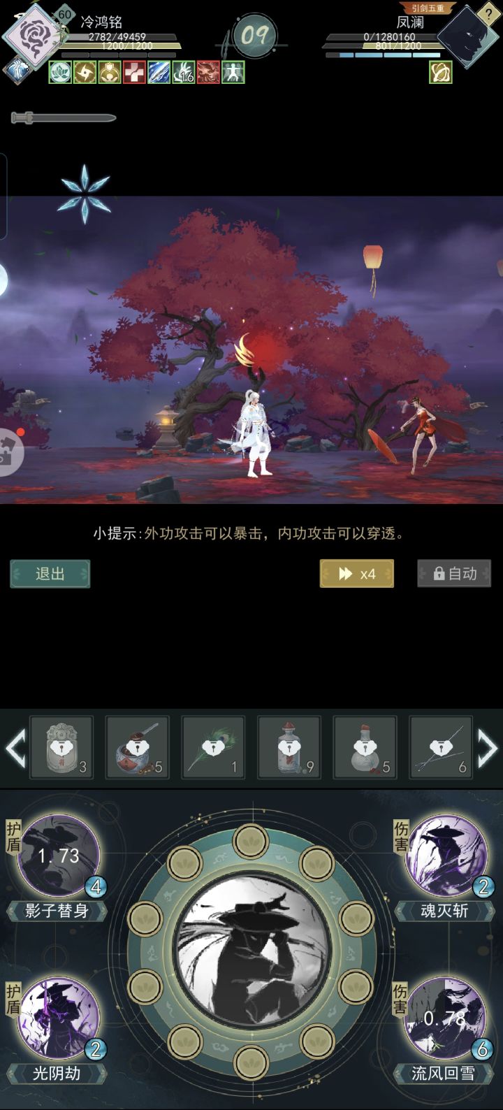 因为一般攻略里的疾风骤雨、秋水瑞荷等条件我都满足不了,所以我别无选择只能另辟蹊径。没想到还真给我摸出一条路子。 轴为:流风回雪-光阴劫-影子替身-光阴劫-魂灭斩剑用秋水,我自用的是红莲,一级即可。坏死要有,橙色玉就行。精铸洗八负八反。能全红自然最好,我自己是两部位全红。 剑式为四凌波+二魔刃,没有四凌波的话,四太极应该也行。经脉最好开局7豆或8豆。 凤澜的BUFF不选反刃和回血,其他的刚好满35。 大概就这么多,也欢迎大侠们指正,我会在评论区补充