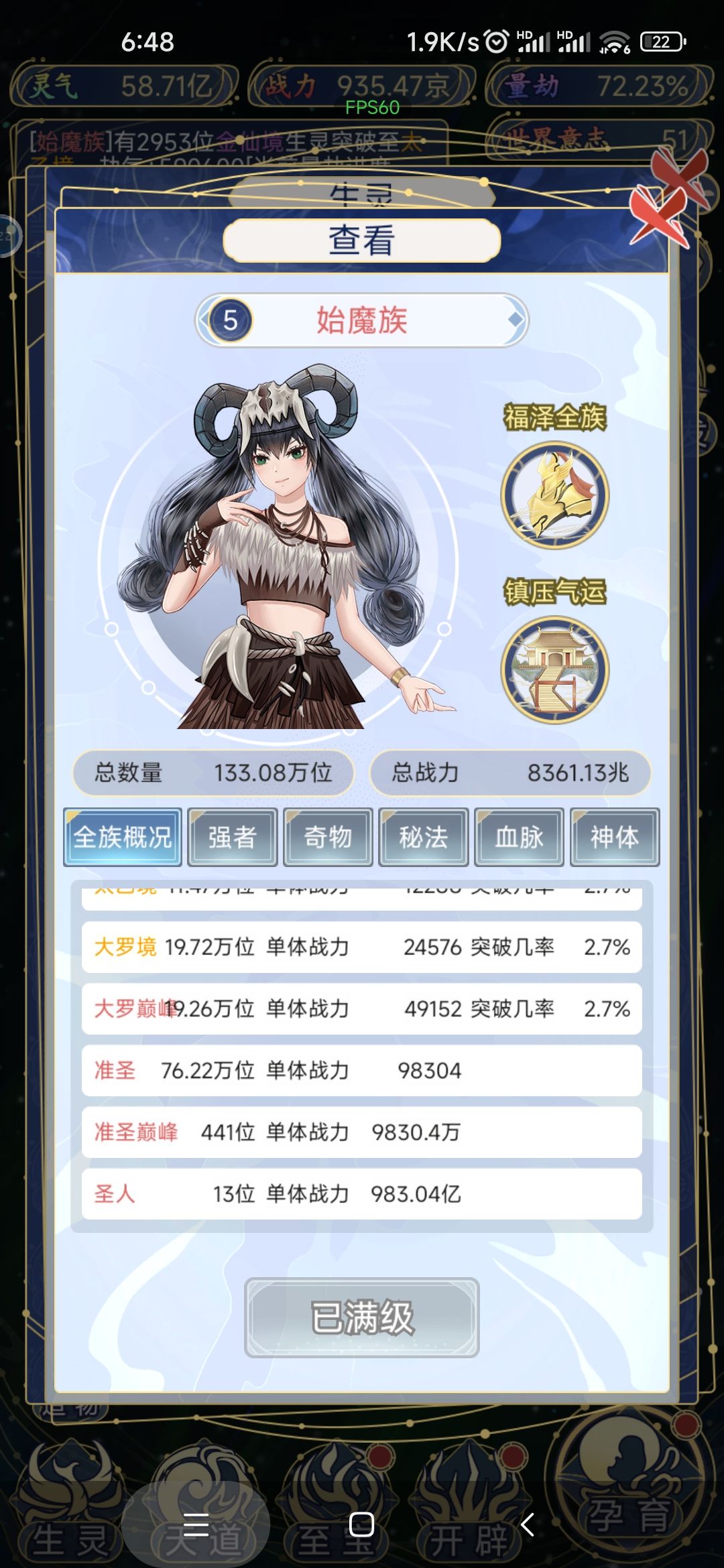 7.重点,大千世界之后,先不要突破世界等级。这时候攒着的所有灵气用来孕育生灵,然后把多余种族灭掉, 保持三种族,人族+两红色种族,重点发展红色种族,让红色种族的战力能超过人族。