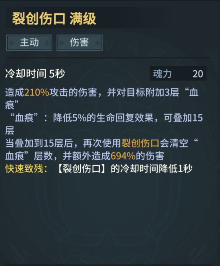 搭配二:濒死复生+嗜血追击+裂创伤口+百刃连闪