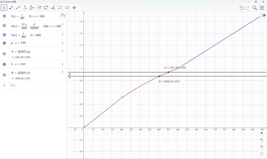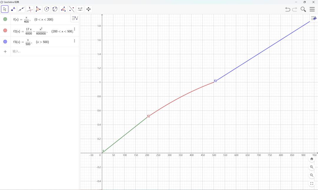 由于暴击的非线性关系使得计算变得较为困难,因此我们将暴击的公式导入绘图软件Geogebar并绘制成分段函数
