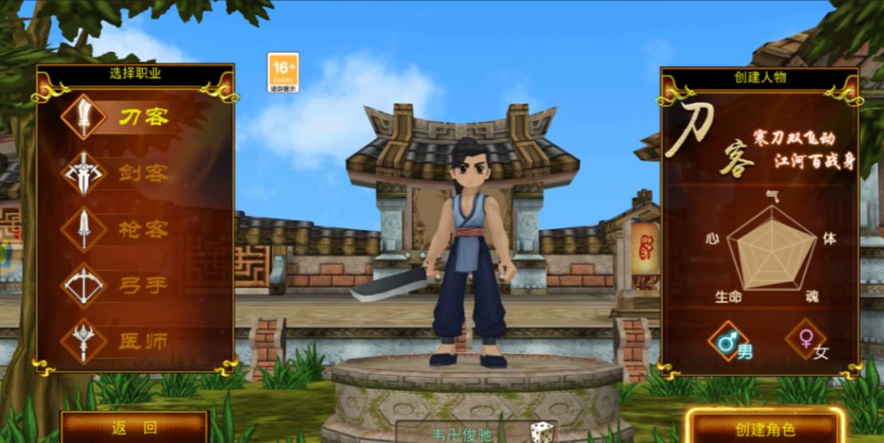 1.职业选择玩家有五种职业可以选择,分别是刀客、剑客、枪客、弓手和医师。