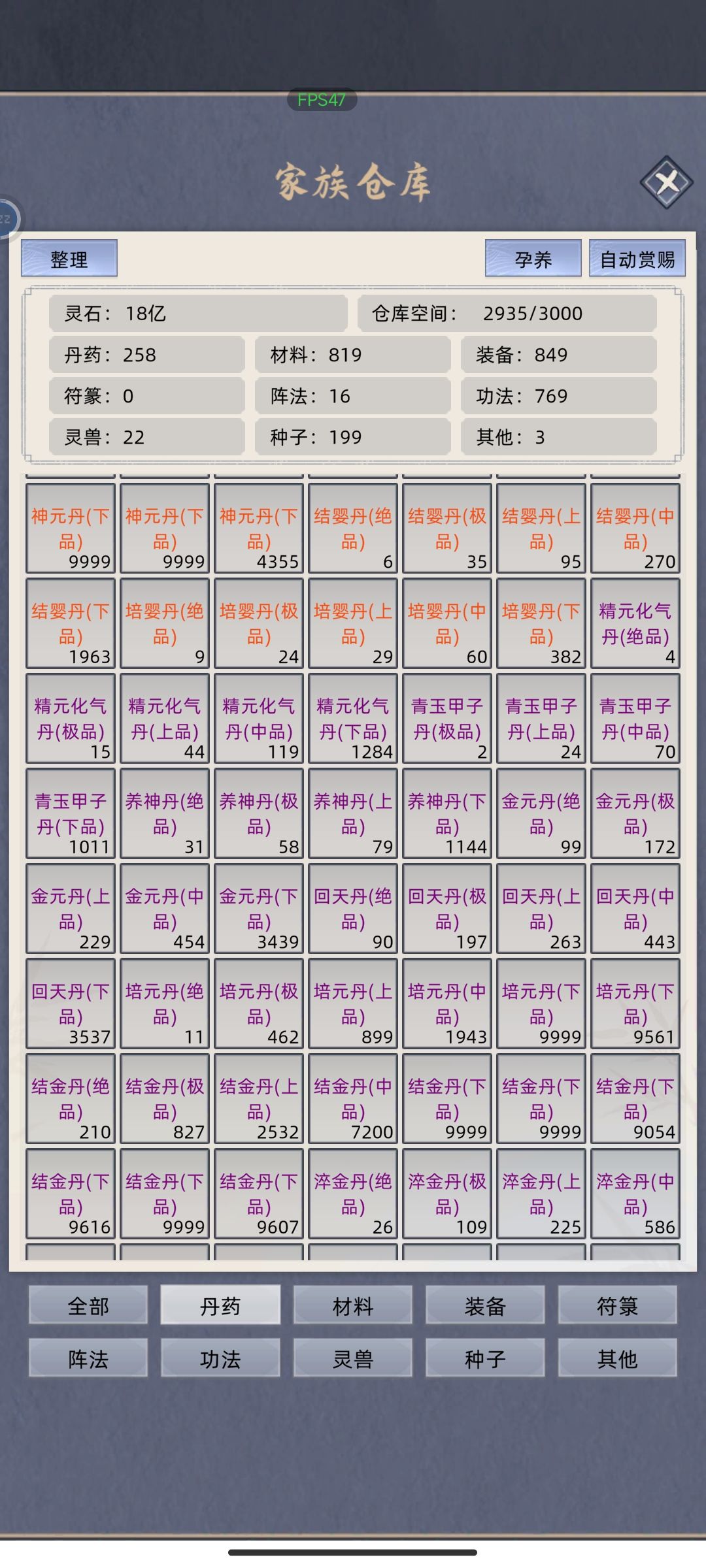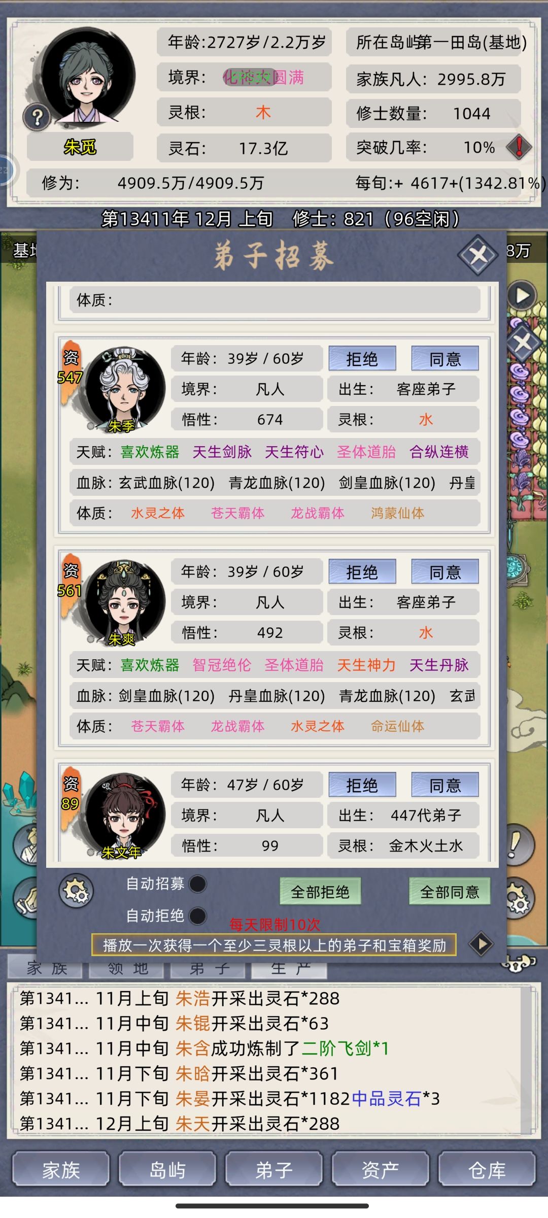 现在玩的档,近一万四千年,十五个种田岛兼养鱼岛,一千多个弟子,其中七百多位化神。玩游戏到现在,数不清多少人问我为什么玩这么长时间不卡顿,今天说一下,首先,卡顿是因为修士人口太多,他们每秒都在交互无数事件,手机运行处理不过来才造成的卡顿,前期如果开天灾那直接把自己培养的优秀弟子也给干掉了,后期开天灾也已经治标不治本了,有的势力化神修士都几百上千了,而且开天灾清理别人的时候连带也把自己家的修士也给清理了,个人不是很喜欢这样做。提供一个方式,大神玩家勿喷,不喜欢可以划走。首先,开自由模式,老祖最好可以选择一些可以继承的天赋,这样以后培养一个优秀的弟子可以跟老祖结婚把天赋继承下去,老祖死后转世之后还可以继承一波,然后选一个太上长老,再把别的势力修士设置成筑基,开局用太上长老把别的势力全部清理掉,一定要把岛屿数量设置到一百以下,不然没清理完太上长老就老死了,清理完这些势力的修士并不会消失,还存在这个档里,只有他们寿元耗尽才会真正消失,排行榜里可以查看,所以不要等到他们成长到元婴化神的时候才清理,难度大不说还得等几千年才会老死,这样家族弟子维持在一千左右,种田岛十个左右,基本上玩个几万年都不会卡顿,还有注意,灵石上限21.5亿,一旦灵石达到上限,赶紧赏给弟子一些,不然会有几率把这个档搞崩溃,前车之鉴