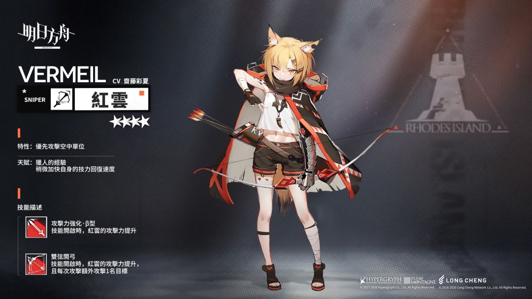 红云,出身地不明,入职前于叙拉古荒野地区进行活动,推测身份:猎人。在狩猎,狙击,散兵战术等单兵作战中展现出不凡身手。