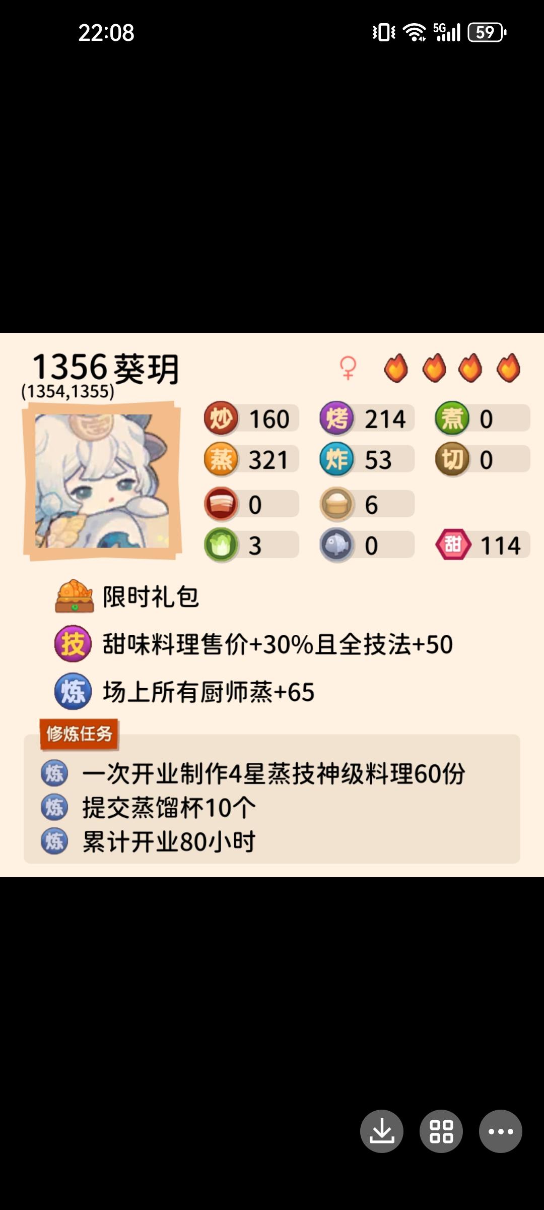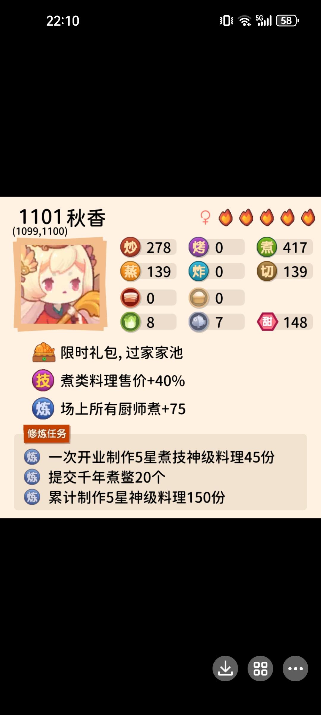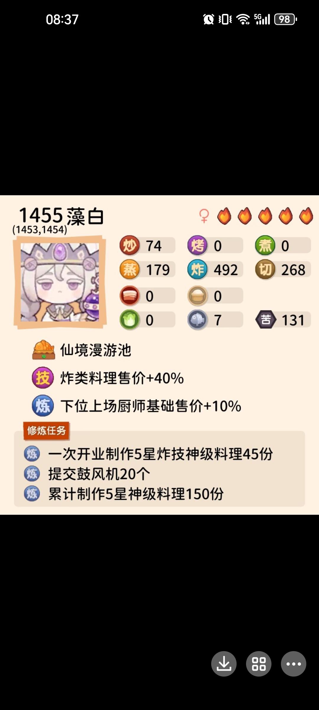 煮:25-灵兮。45-玄离,王师匹,呼延吒绛。65-师焉。75-秋香。 烤:25-异域池的4火厨格格。45-火姬,风息,黑鸦,阎小罗,花艳红。65-霍域