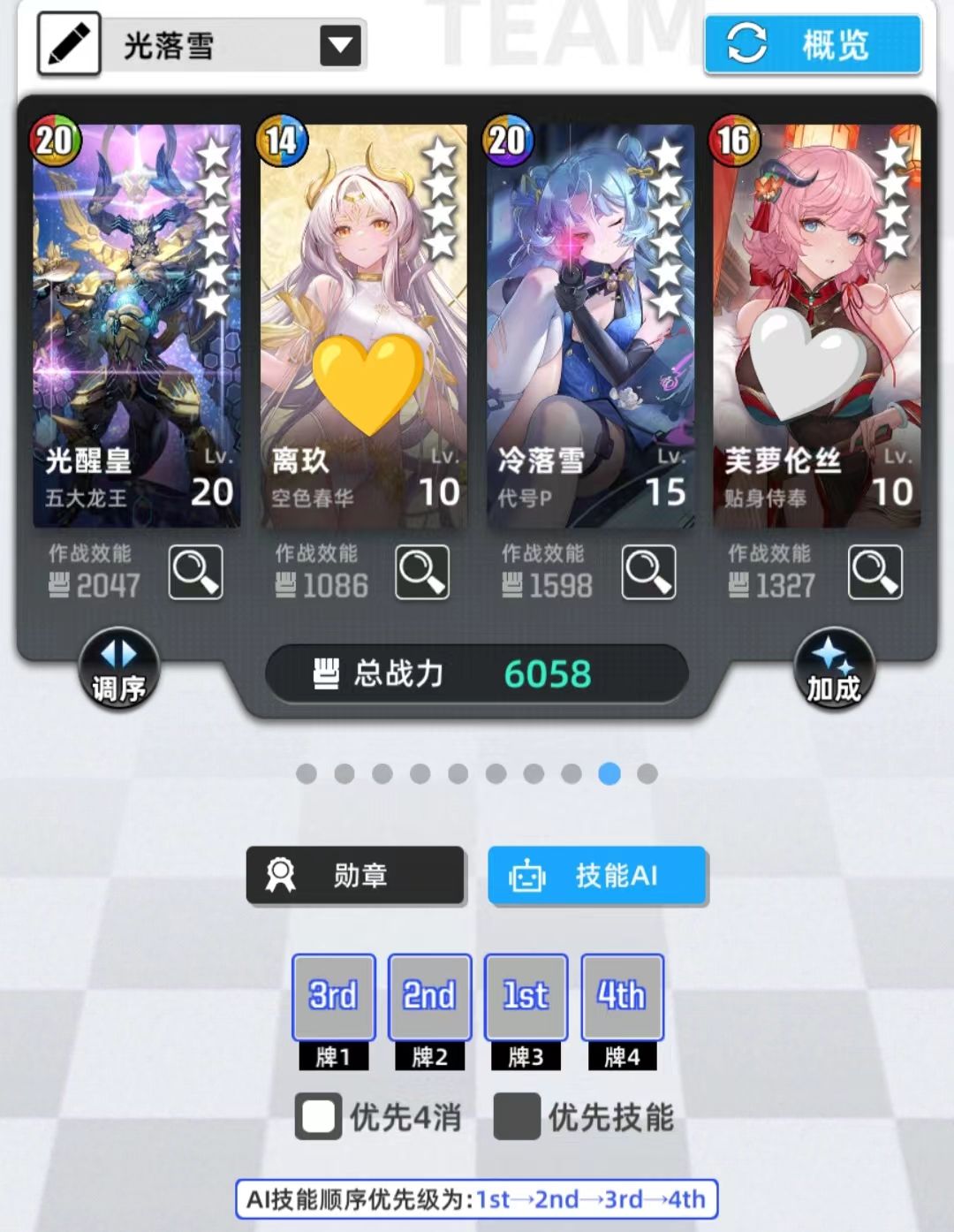 优先输出并上冻结开潮汐2动离玖,由于卡位在冷落雪前优先吸收充能,因此首次启动大概率优先行动挂全体沉默!后续则在冷落雪输出回合后挂沉默保证放回合高容错![[表情_酷]](https://img.tapimg.com/market/images/edd50e702f508971043f5619f686740e.png)