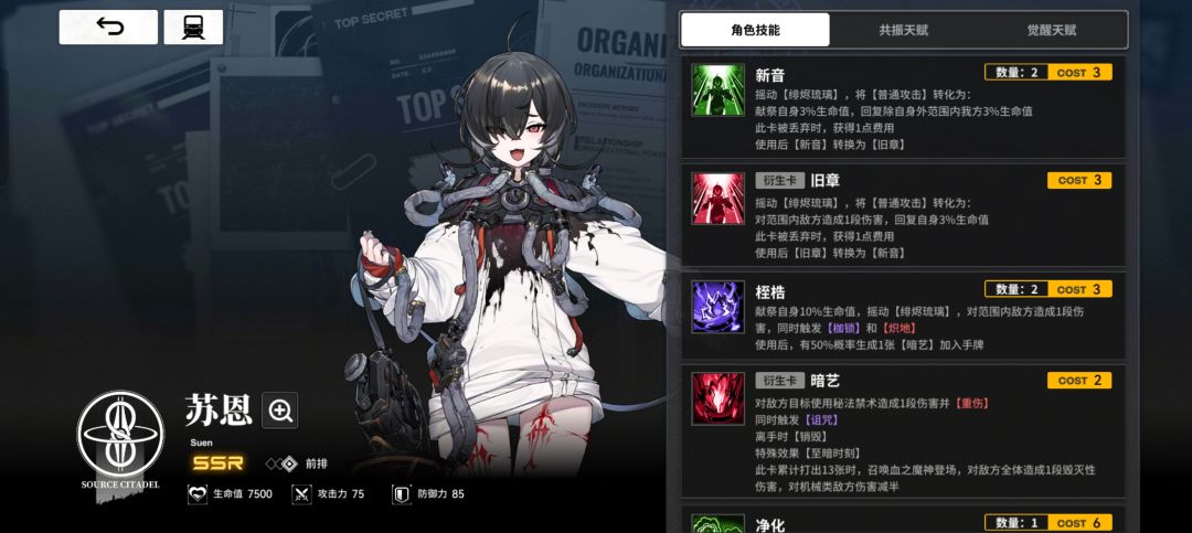 承伤位:SSR苏恩,本身也是双绿卡的配置来提供黑卡,自身作为有回复能力的优质前排的同时还可以与约书亚的暗艺配合来补充伤害。