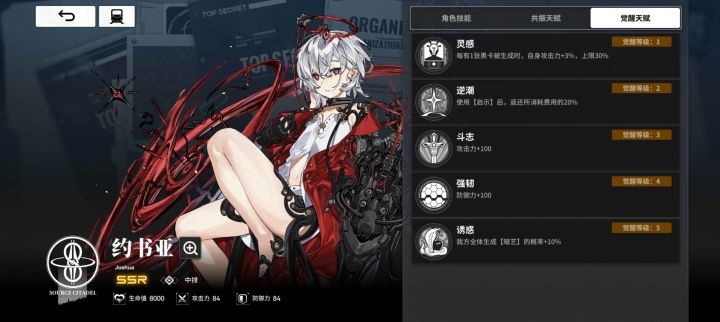 队长位:SSR约书亚,队长技有足够能量即可启动,本身的手牌【智识】和黑卡息息相关,在有足够黑卡的情况下至少可以提供四点能量,二振后更是可以提供六点,并且可以突破能量上限,一觉自带练功,二觉保留20%能量非常关键。