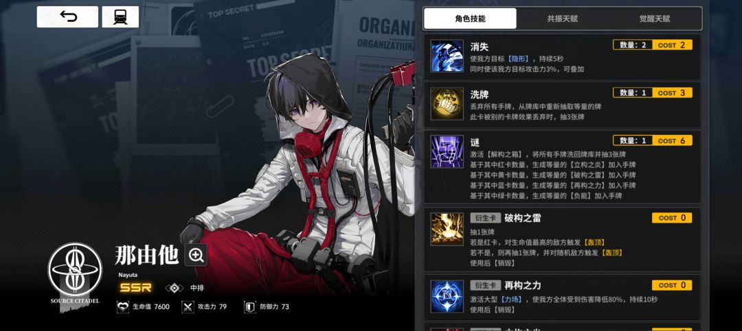 黑卡/过牌位:SSR那由他,【洗牌】可以提供快速的过牌能力,大招【迷】可以通过检索绿卡生成大量的黑卡,二振提升手牌上限防止黑卡卡手也非常关键。