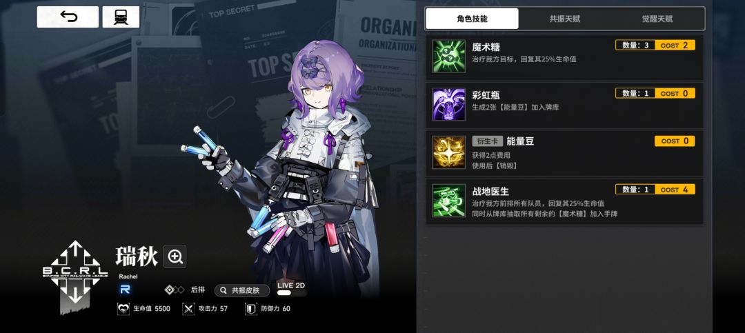 绿卡/能量位:r瑞秋,本身拥有大量的绿卡,同时大招也可以抽取绿卡,二技能的能量豆简单粗暴的回费,五觉的绿一色可以瞬回十点能量,同时也可以突破上限,而多绿卡的配队可以比较轻松的达到这个条件。