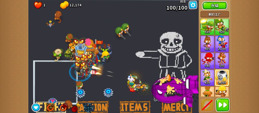 点击开局试了几次才过所以说一下三毛放法。下毛往左上挤,右毛往左下挤,上毛要适当远离路径才能让右毛多打几次穿透且下毛多打左路。r6如果左路第一个绿气球被射中2次说明上毛离路径不够远。r6结束后上毛升010,右毛改强力。r7比较极限但我试了两次都过了,如果过不去可以尝试在右毛射中连着的蓝绿气球后改第一个。r7结束左路放毛4。r8没啥压力。r8结束后,图中我升右毛010能过r9,但后来再试只升右毛就过不去了,猜测应该是上毛和毛4的位置导致的。可以考虑升俩毛或者再放毛5,索敌目标自行调整。