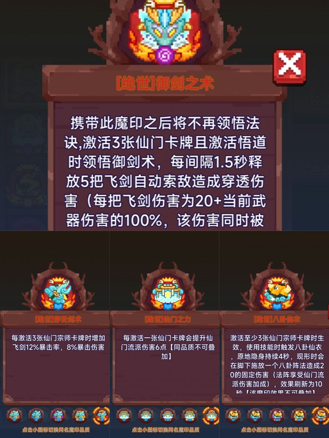 穿云剑术(法印)给御剑增加暴击率和爆伤,可同品质叠加。(纯剑修推荐佩戴三穿云一仙门之力)