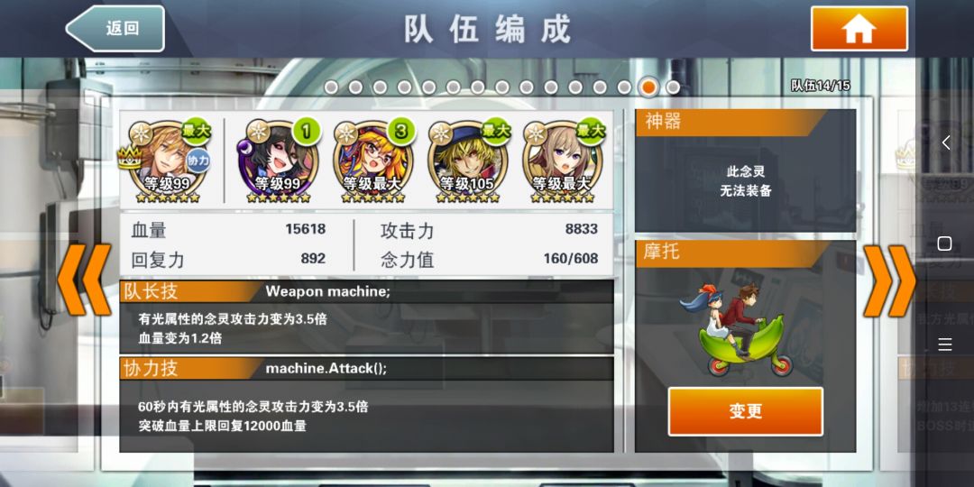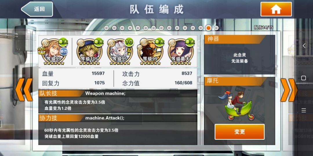 配置如图,机兵buff队长 一号位是连射,二号四号都是buff卡,三号是跳c。因为上限盾原因不需要炮和割,有连射上连射,自由卡位带跳c和buff就可以了。肝卡二倍buff,会长,甚至四星叶月,都可以带(现在有t勺子了,也是个很好选择)。