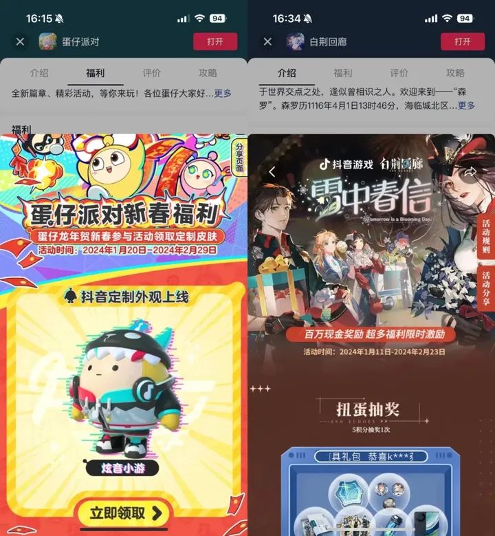 抖音游戏在此次“2024新春环游记”中上线了“道具直发”,这一功能打通了抖音端与游戏任务系统,用户绑定游戏账号后,完成游戏内任务后可在抖音领取直发奖励。DataEye研究院获得的数据是:在直播、道具直发等多重加持下,《白荆回廊》下载组件环比增加6倍。过往,游戏外的内容,与玩家互动往往只是点赞、评论等等,而领取道具,让用户参与互动层次更进一步。也能通过用户在游戏内容互动中洞察用户更深层次的诉求,用内容推动互动行为,为游戏活跃用户,还能帮助厂商做好游戏生态里的内容互动一环。(三)赛事造节,巩固IP生态春节前后,《和平精英》开启了“龙跃长城”新春版本,在2月2日上线了《我在P城很想你》由知名演员倪大红和李勤勤主演,这不是《和平精英》第一次脑洞大开了。2月4日,游戏邀请“华晨宇”开启了海岛年会,该场直播累积曝光达4700万,看播人次超170万;2月5日“青木川&晚玉”带来了赛事直播,该场直播曝光人数超3000万,专区看播增长18%。同时《和平精英》在在北京、广州、重庆、郑州全国四城点亮春运回家路,欢迎各位特种兵回家。首都机场变身出生岛、羊城变身Y城,春节回家也要回海岛里的“老家”。再深一层,平台与游戏推出限定活动、定制皮肤,也正成为一种趋势,典型如抖音游戏推出《蛋仔派对》定制外观《炫音小游》。定制(而非统一)的活动,开拓与玩家和粉丝互动通路,助力于该游戏的用户留存和长线运营,并进一步扩大 IP 影响力和商业化能力。如此“豪华”的数据得益于游戏内容供需的繁荣生长,像《白荆回廊》、《冒险岛:联盟的意志》、《冲呀!饼干人:王国》等新游也抓紧在新春环游记这个窗口期宣发造势,甚至《恋与深空》、《闪耀暖暖》等女性向游戏也投入了大量资源进行宣传。例如《恋与深空》开启了“深空集五福,过年好幸福”抖音创作征集活动,通过征集游戏幸福瞬间、手工作品、大头贴、与家人朋友介绍游戏、请家人朋友喊出口号,发布视频,即有机会获得游戏周边、现金奖励。截至2月26日下午,#恋与深空话题已经超过40亿次播放。