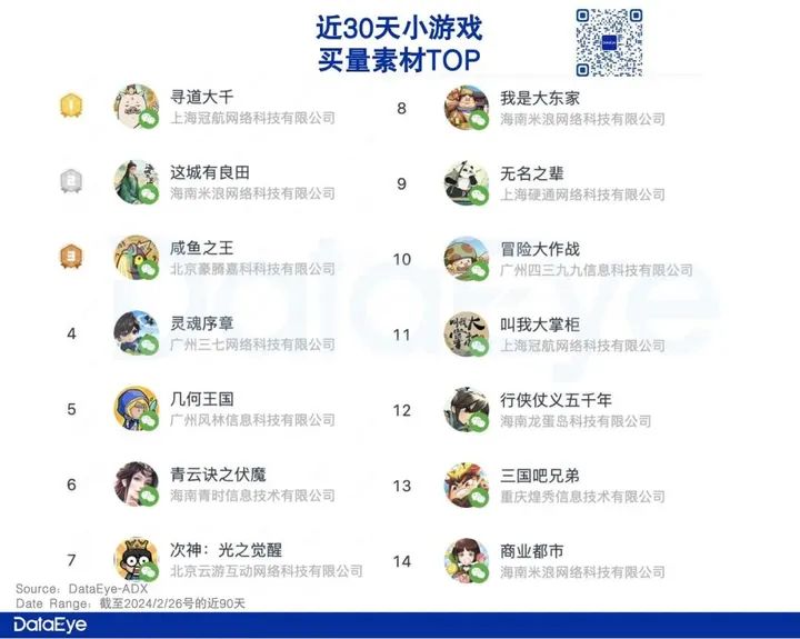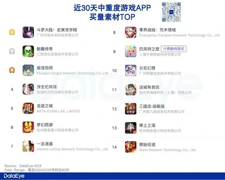中重度APP方面:大厂霸占,贪玩凶猛。ADX数据显示,截至2月26号的近30天,以投放的去重素材量计,中重度手游APP方面,贪玩《斗罗大陆:史莱克学院》《骷髅传奇》位居前二,同为贪玩的《龙迹之城》位列第五。排名前列的老面孔还有,友谊时光《浮生忆玲珑》、网易《梦幻西游》《率土之滨》、雷霆《一念逍遥》、广州诗悦《长安幻想》、益世界《这城有良田》、灵犀《三国志·战略版》、巨人《原始征途》。游戏买量成资本游戏,实力大厂主导。