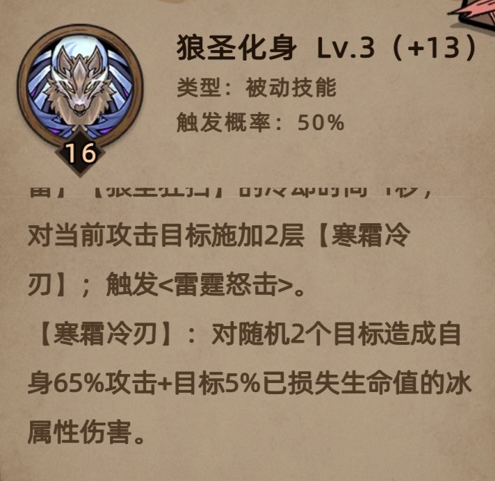 “寒霜冷刃:对随机2个目标造成自身65%攻击+目标5%已损失生命值的冰属性伤害”