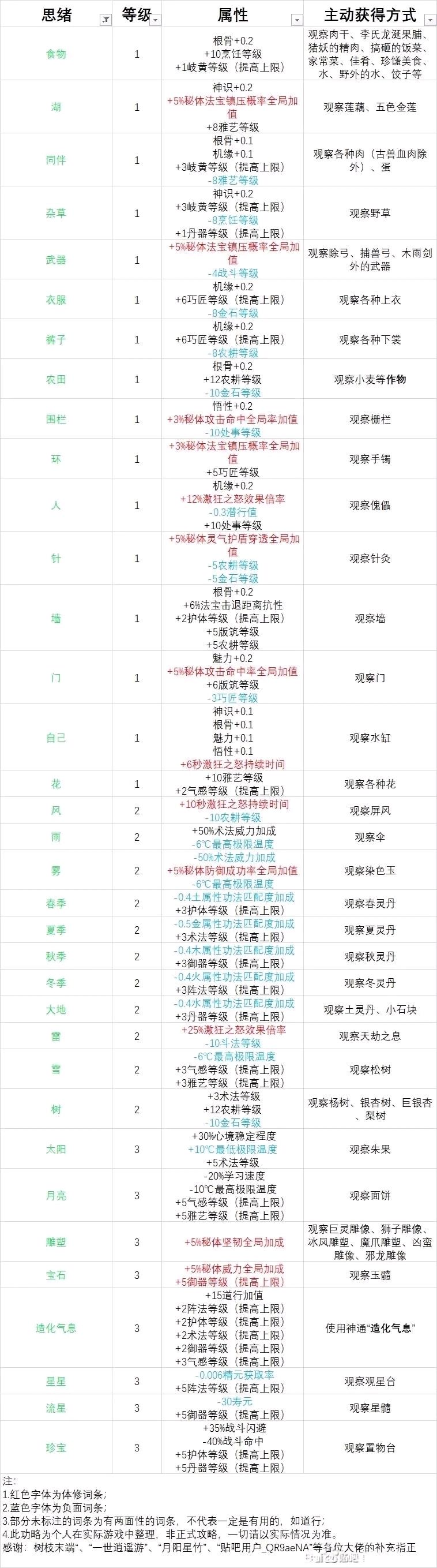 绿色:春天(护体,夏天(术法,秋天(御器,宝石,珍宝,流星,造化气息,花,墙