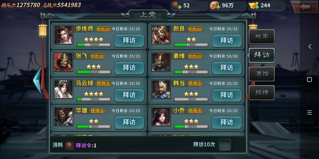 二、地牢/拜访在主线副本进度中,会俘获守城的将领,收入地牢之中,可通过“拜访令”对其进行招降与拜访来激活并获取更多将魂,是主要的获取途径之一。