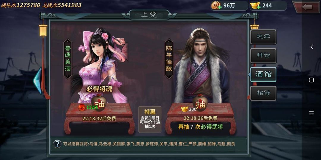 三、酒馆/招待酒馆与招待也是获取武将的主要途径之一,酒馆中消耗“美酒”或者元宝,可募集更多的武将。