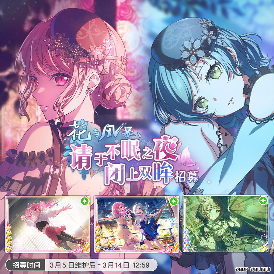 ※本招募附赠「花与风暴,请于不眠之夜闭上双眸招募贴纸」,消耗该贴纸可在「招募贴纸交换所」兑换相应成员或道具!