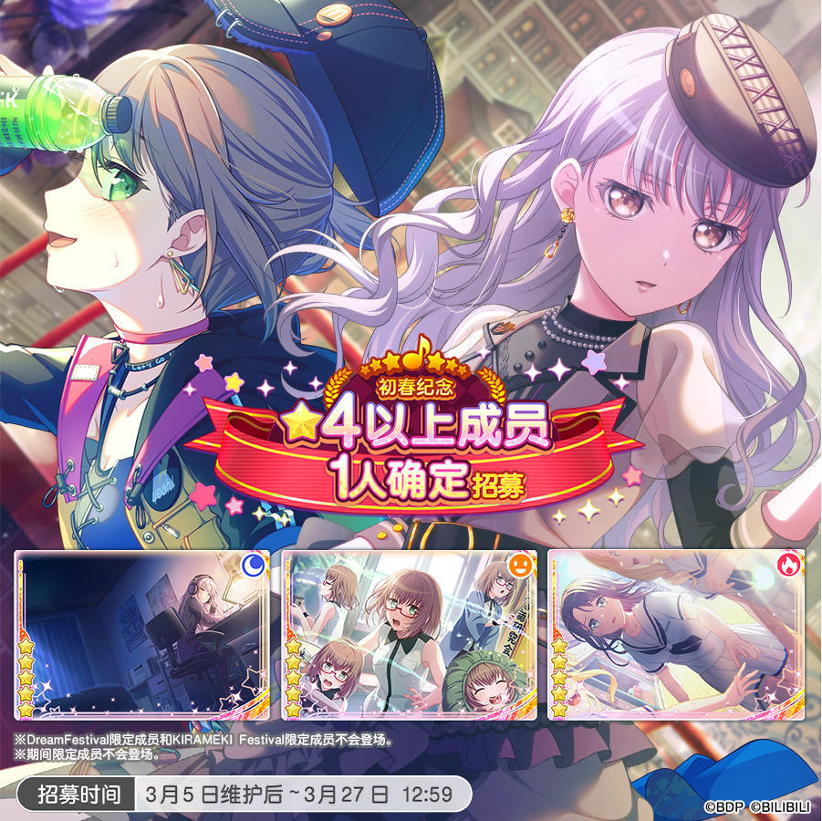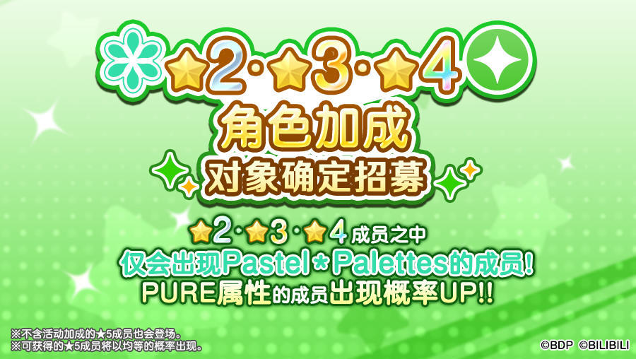 3月5日维护后,「★2・★3・★4角色加成对象成员确认招募」开启,★5成员以外仅会出现符合角色加成的★2・★3・★4成员!同时符合属性加成成员的出现概率UP!招募范围内出现的★5成员出现概率不变。