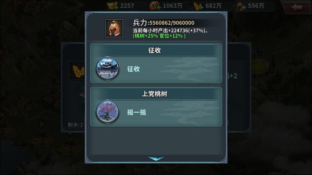 4.兵力。国战玩法中的主要行动力,可通过:特惠礼包、校场生产、桃树摇一摇,其他活动。