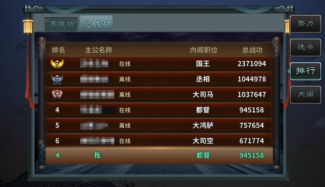 【排行】排行记录了本国的玩家,周国战战功,总国战战功,积极的在每周参与国战,可以给国王分配内阁职位做一个参考,给予战功高积极且活跃的玩家,更高的官职职位。