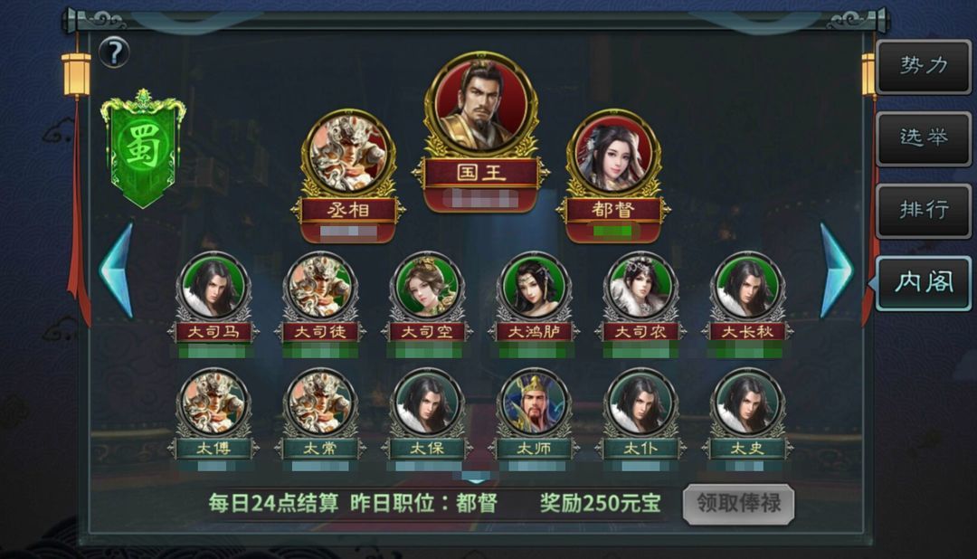 【内阁】内阁中分配到一定的职位,拥有一定的权限与加成,同时每日还会根据内阁职位发放元宝奖励。