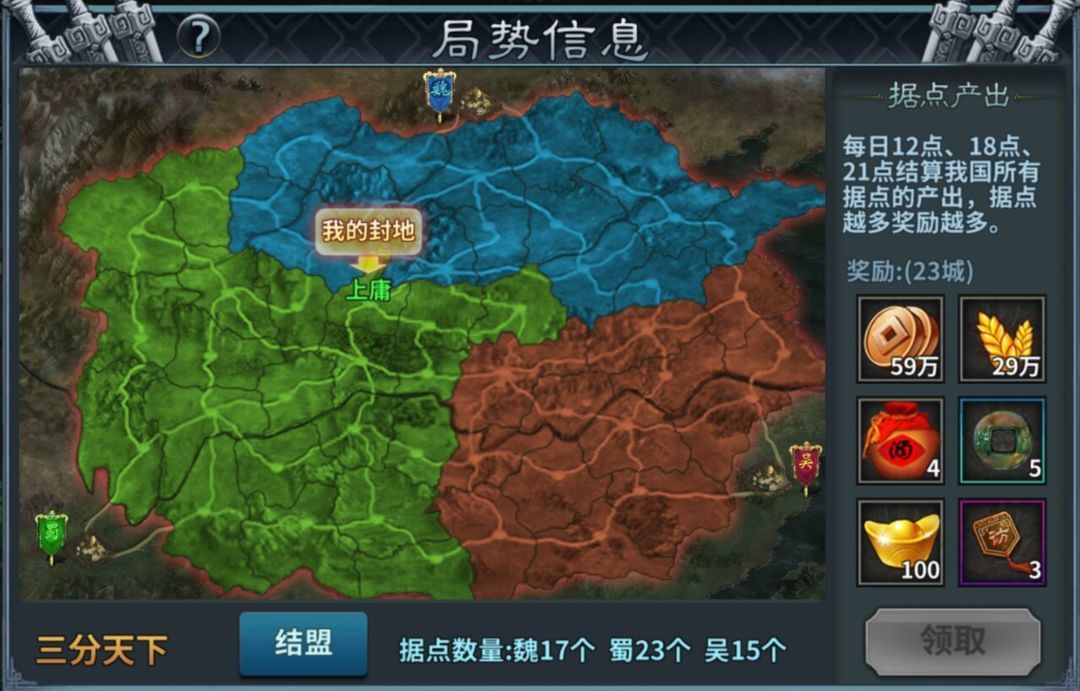 ②.根据本国占领据点的数量,在每日12点、18点、21点,可领取据点产出的局势奖励。