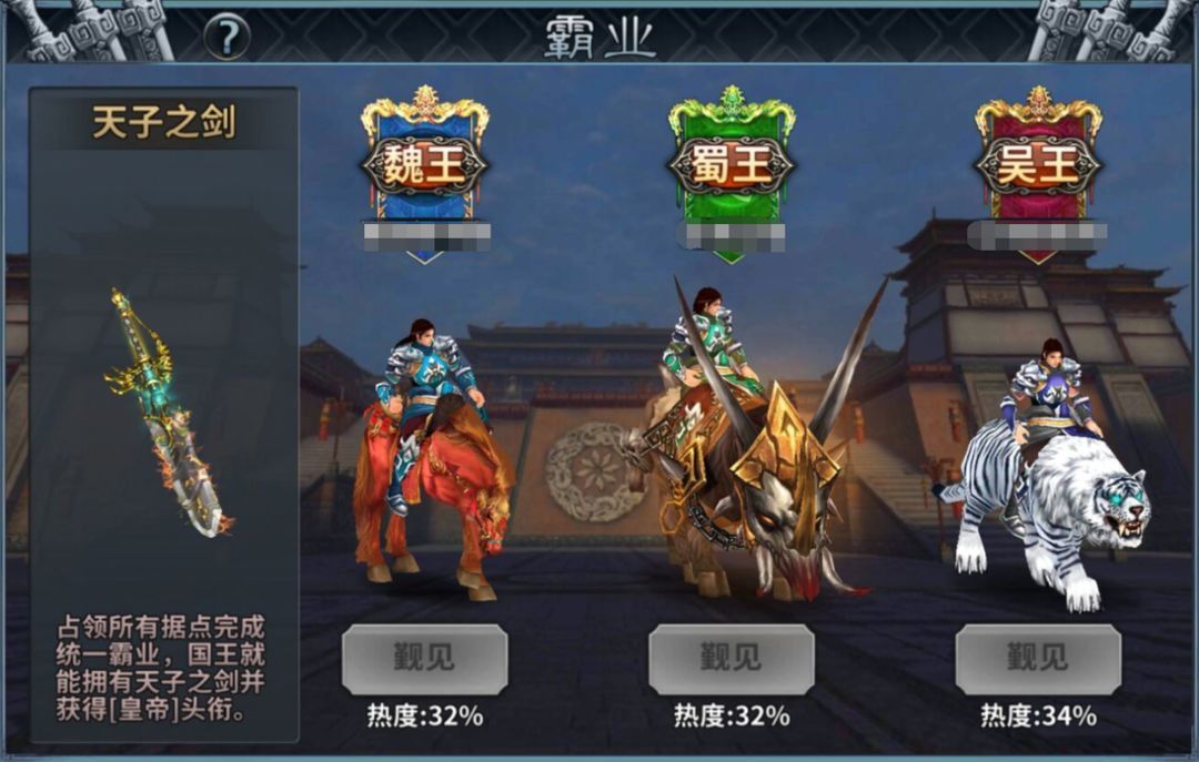 ③.霸业,每天可以对三个国王之一进行觐见获得军令;完成一统的国王将享有“皇帝”头衔和象征身份的天子之剑持续1周。