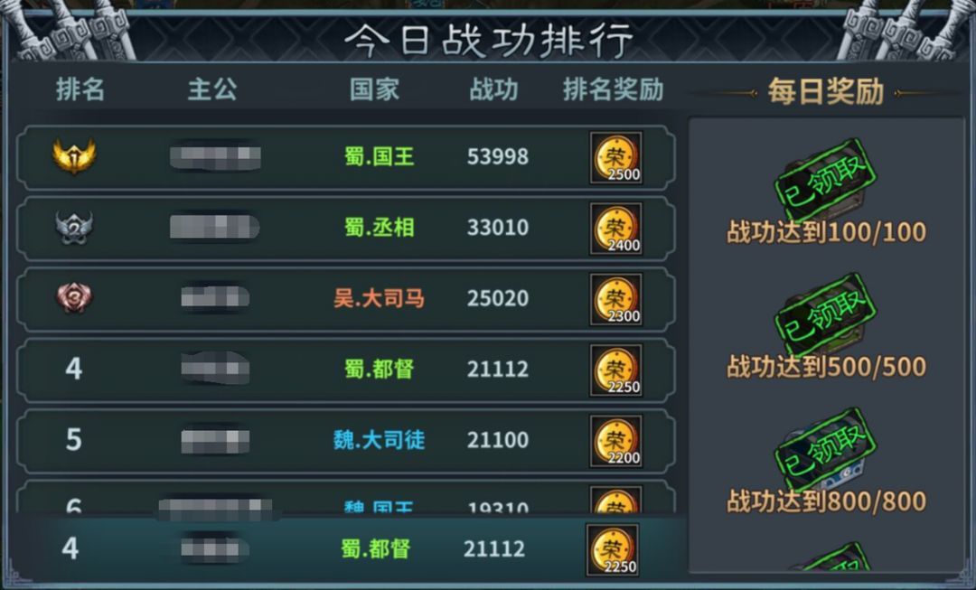 【排行】排行榜记录了今日所有国家的玩家参与国战获得的战功,根据战功排名,每日还会发放排名的荣誉币,荣誉币可在国战商店兑换所需物资,除每日排名奖励外,还有每日战功到一定程度即可领取的每日宝箱奖励,获取一定的游戏资源。