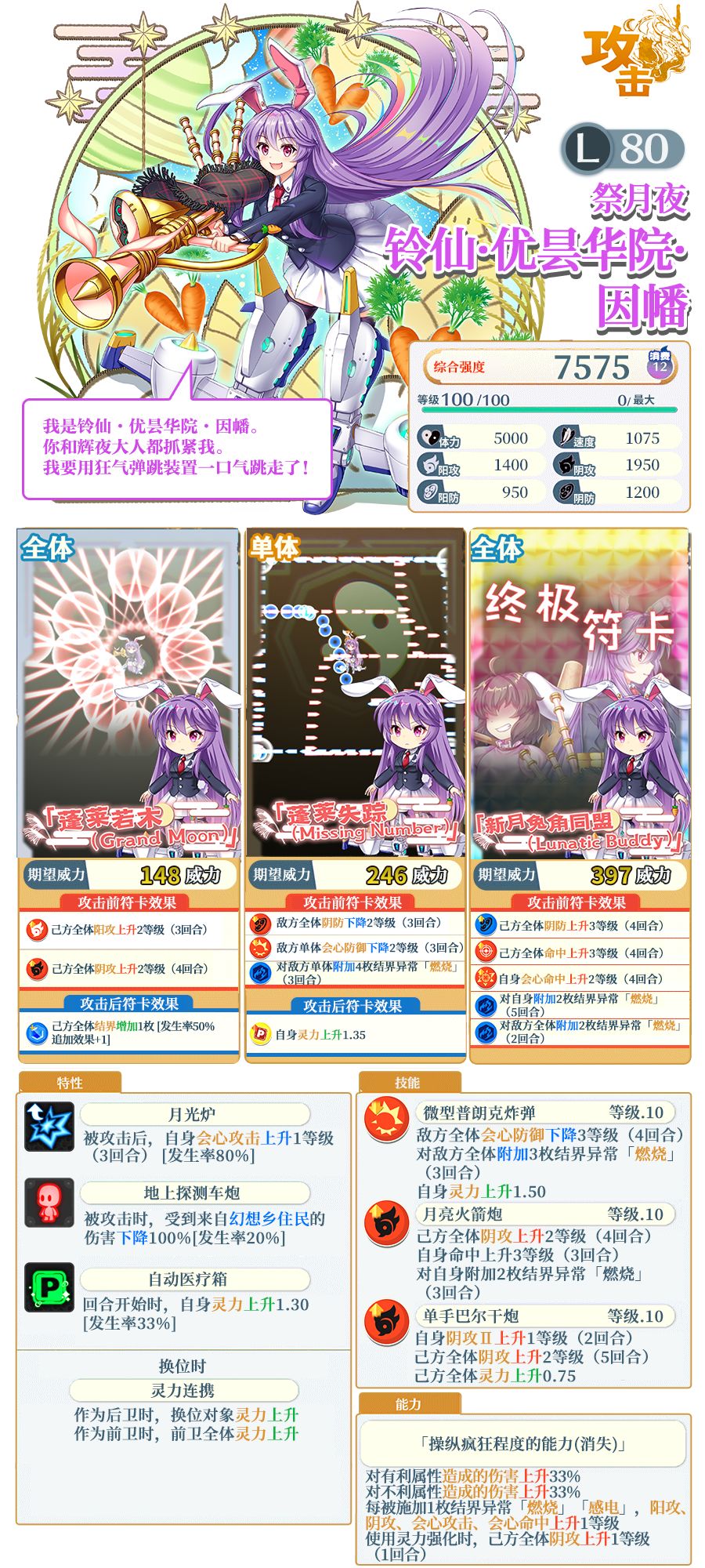 ※「[祭月夜]铃仙·优昙华院·因幡」需要使用同名伙伴或者「灵之替身」进行界限突破。不同泛异记号的伙伴及「灵之替身」外的其他替身无法对其进行界限突破。