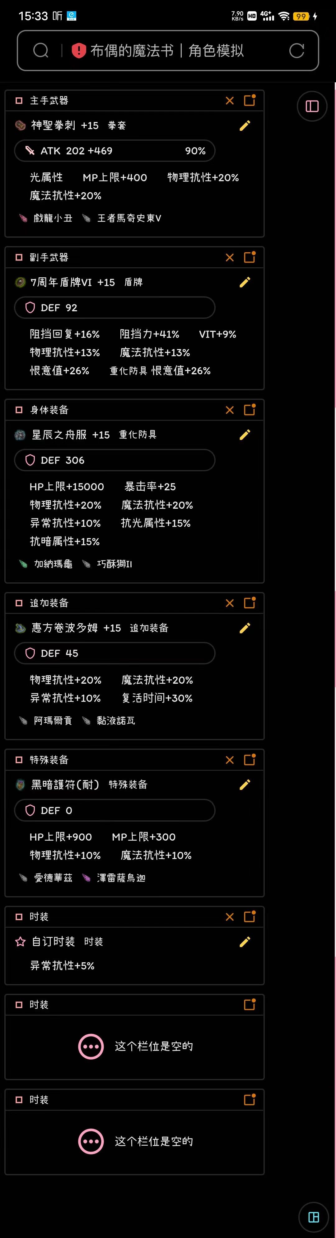 以上是爱德华兹版本更新后的发展方向。现版本根据自身,暂时可以用单孔皇女衣和单孔冬季服饰代替,等待版本更新。对于时装要求需要15点异常抗性。料理需求因为暴击率不足问题,并且皇女衣和冬季服饰都加500蓝,可以把蓝上限改成暴击率即可。