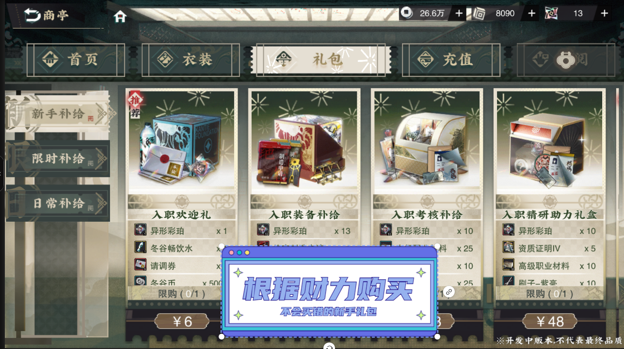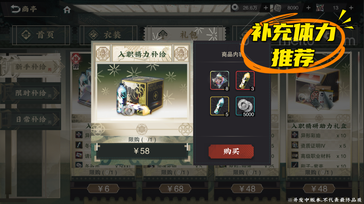 在商亭界面的推荐分页中,就可以看到入职招集补给和入职精力补给!经粗略估算,这俩礼包内的道具价值,这样的价格,等于2折优惠!这里特别推荐精力补给,里面不仅有大量体力恢复道具,还有8个异形彩珀,要知道30块也就只能买6个。各位收藏家自行体会这个礼包的含金量吧~