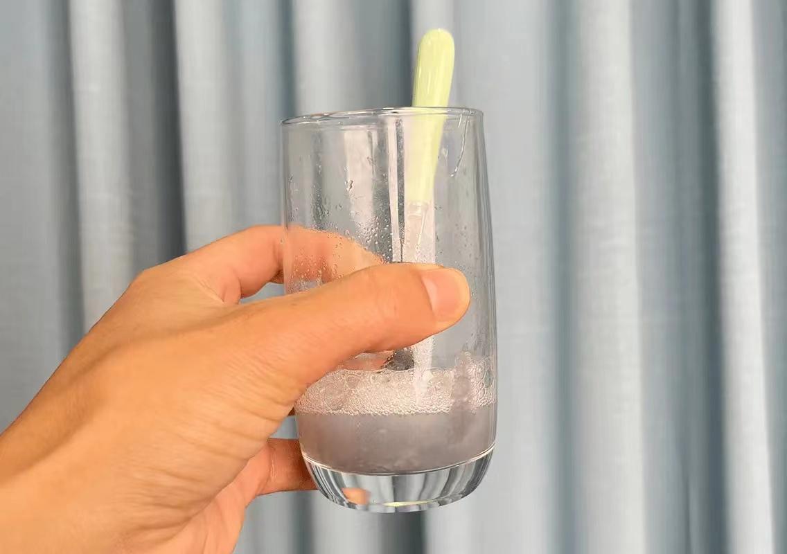 溶于清水中,测试一下PH值,PH值是7左右,中性配方,还算亲肤。