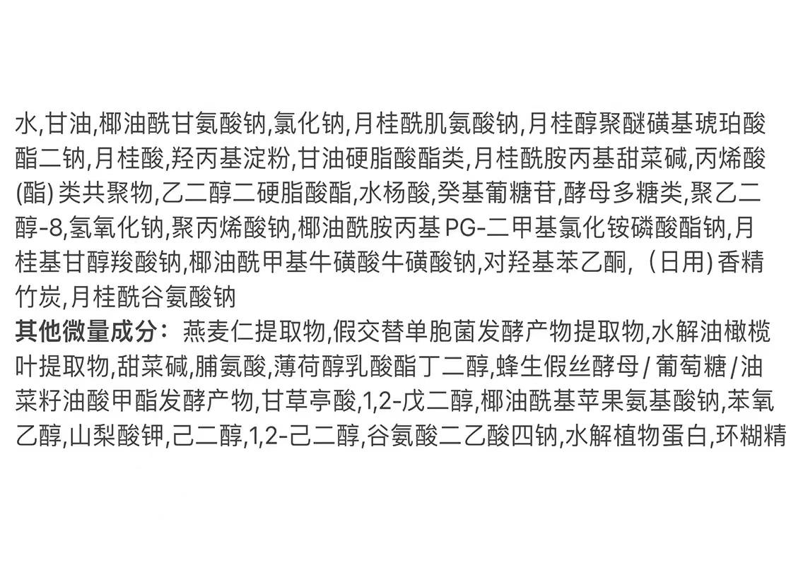 再看看成分,清洁主体是,氨基酸表活椰油酰甘氨酸钠,辅助表面活性剂是氨基酸表活,月桂酰肌氨酸钠及7种常见的温和表活,属于氨基酸复配体系洁面,两三种表活可以搞定的事,整了十多种,反而容易增加致敏风险,个人不太喜欢。