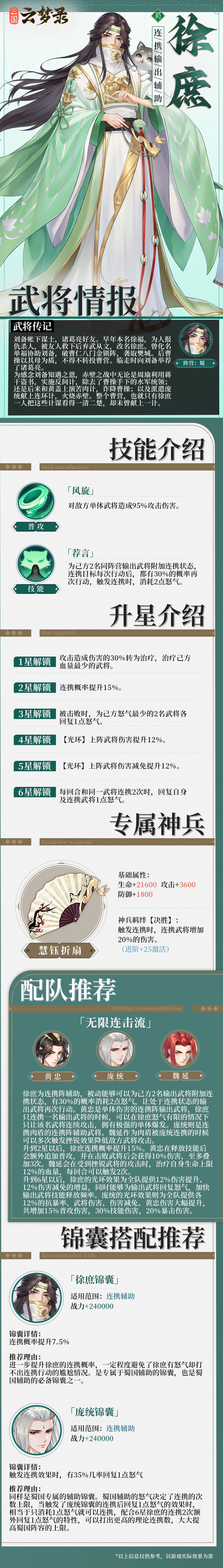 而《三国云梦录》中的徐庶作为一名连携辅助,他最大的特点也是持久!徐庶善于让蜀国输出武将持续再动,堪称“一回合更比六回合强”,不可谓不持久!那么接下来就让我们一起来看看这位绝世策士的详细介绍吧!