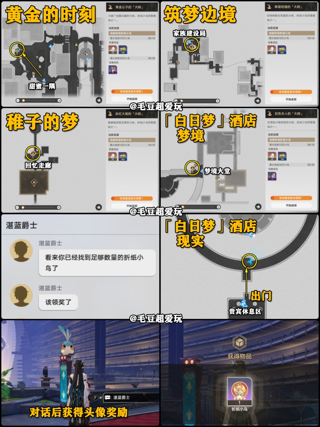 敲黑板,这里是进攻略前的小提示:只有梦境地图有折纸小鸟的收集,开拓者可以在地图中<小鸟图标>处查看当前地图的收集进度,全部收集完成后需要前往目标点对话领取奖励,头像奖励需要60个点位全部收集后对话获取。找不到的点位可以前往对应的收集篇查看具体的前进路线。