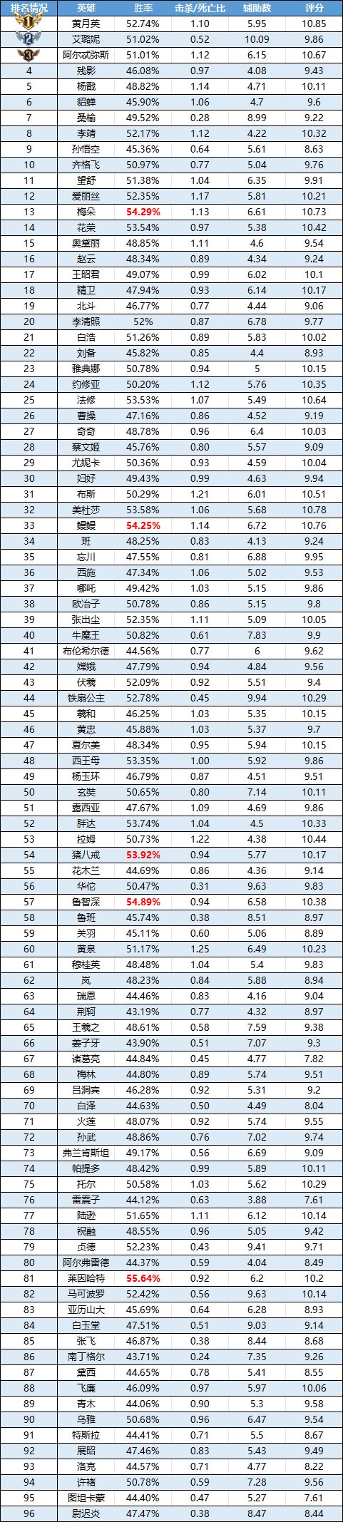本周,黄月英登场率更进一步,双榜都进入了TOP5。高段位榜这边,孙悟空不光保持胜率高,评分也进入TOP5(让我们期待一下,下周是不是登场率也进入TOP5呢?)。3月都开始了,张出尘还是ban榜榜首...