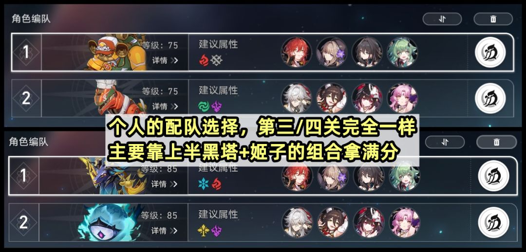 【配队推荐】个人使用的攻略阵容是:第三关和第四关一样,上半都是姬子+黑塔+阮梅+藿藿,下半都是景元+停云+花火+符玄,buff方面都是选的第一个。自动战斗即可拿满奖励。下半景元虽然对上了弱点,并且现在还有花火,不过神君出伤慢的问题依然存在,所以有培养姬子黑塔的小伙伴,上半尽量冲下满分,下半无论选什么队伍都会轻松不少。