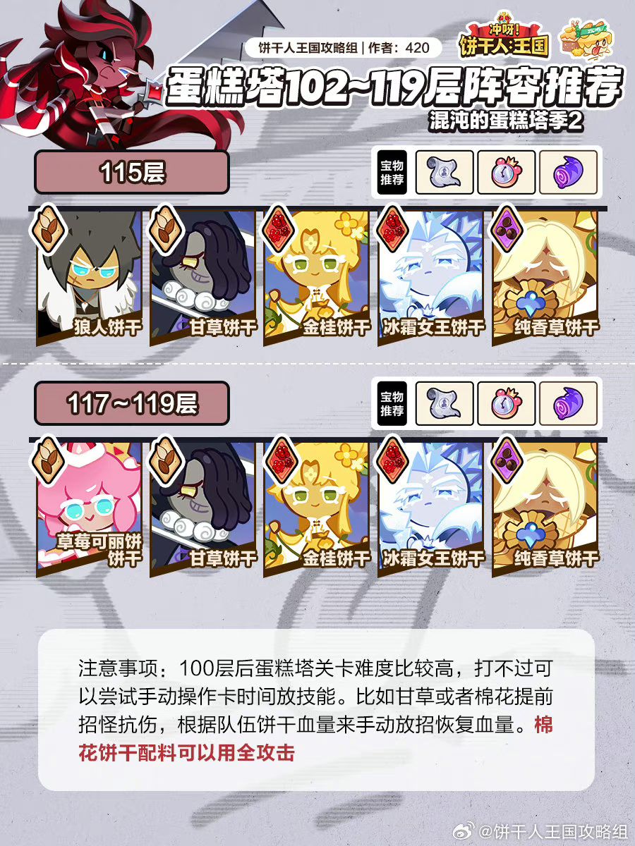 蛋糕塔第二季,第102~119层阵容推荐。和上赛季一样,在遇到过不去的层数时可以手动放招卡饼干技能。