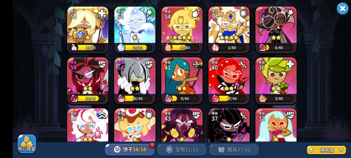 这两个月我自己饼干城堡12级(目前的最高级别)。所有饼干和宝物全收集,关卡目前是普通卡最后一关了,我比较佛系就没有去抄作业,顶多去看看王国攻略组的饼干配料搭配。