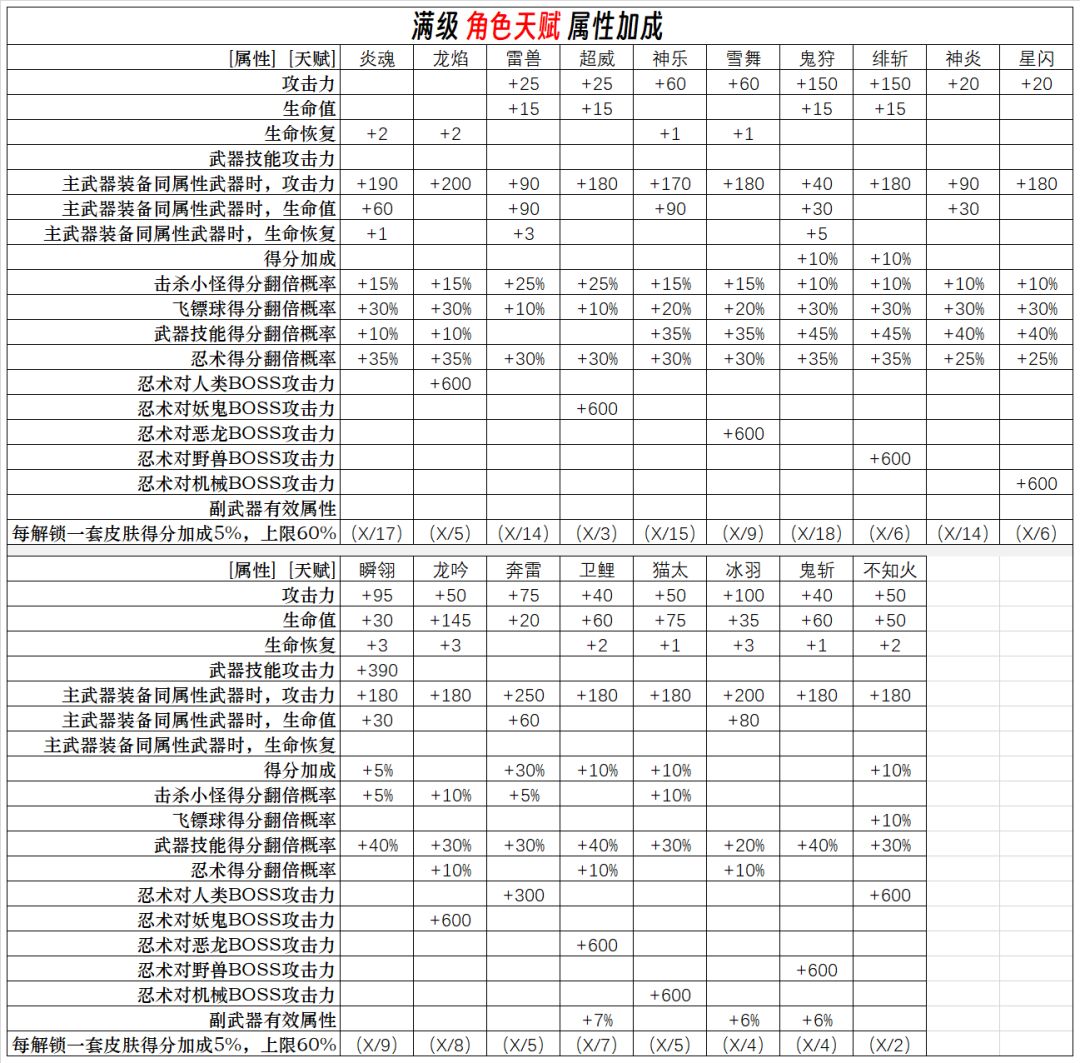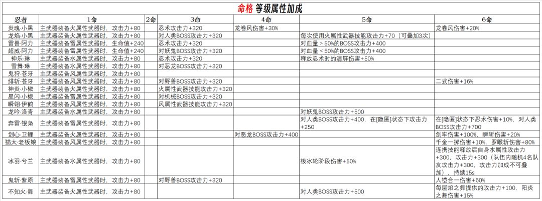 1.忍者等级提升的数据比较复杂,且在对比不同测试的数据后暂时无法得出统一的准确的结论,因此只列出了生命值和生命恢复这两项;