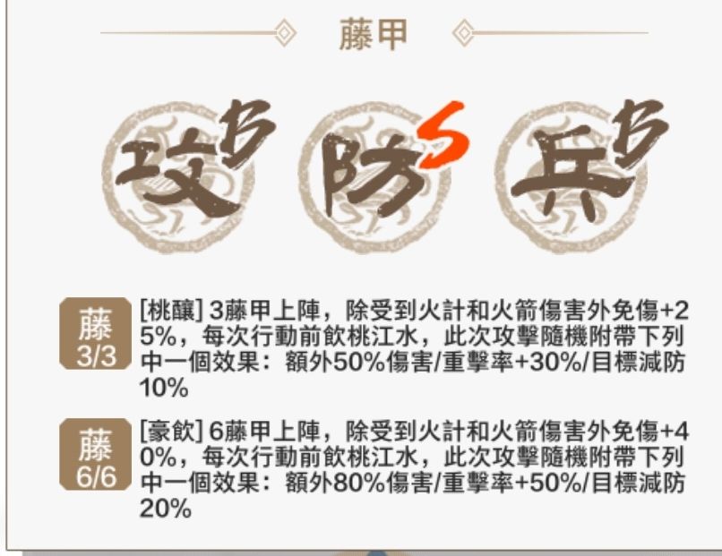 攻擊不強。防禦卓越。血量較優。和藤甲是唯一一個有控制的坦克。多配藤甲/謀士/騎兵。