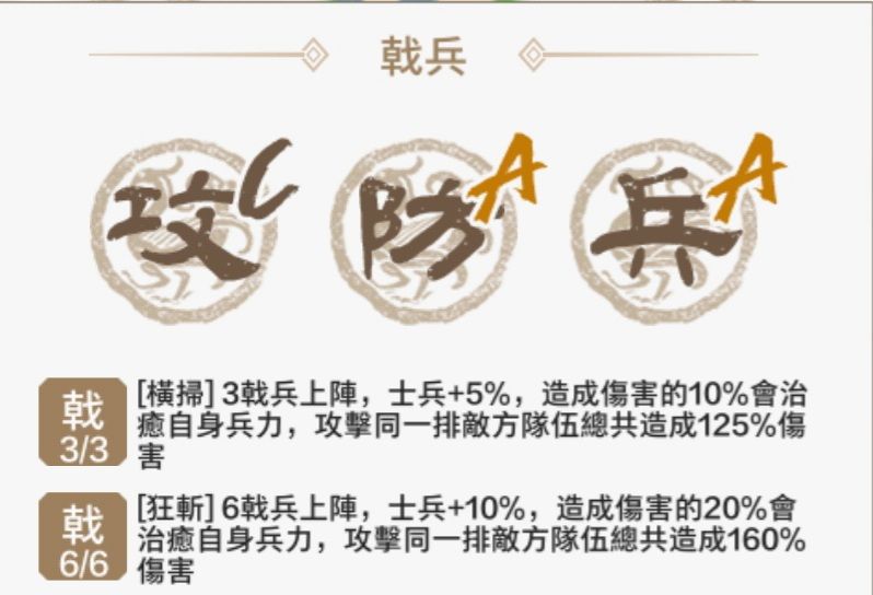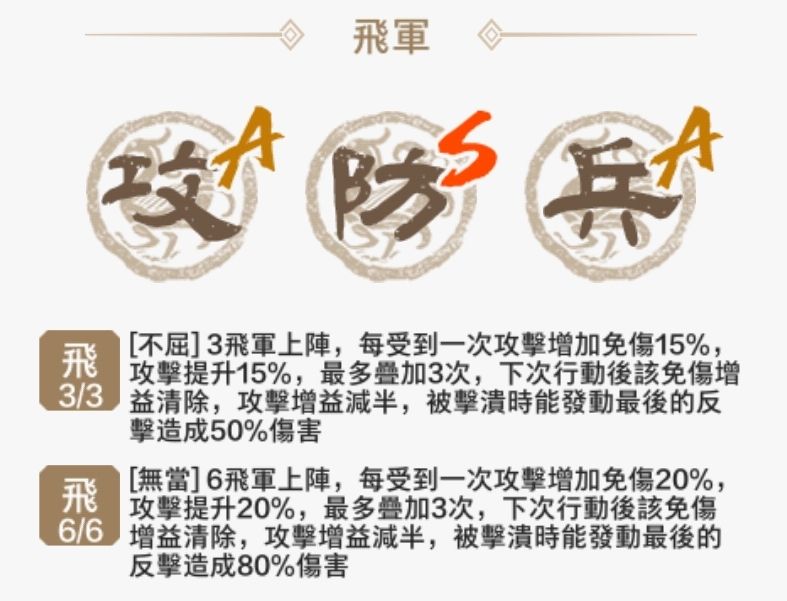 攻擊/防禦不俗。血量亦佳。多配槍兵/弓兵/謀士。