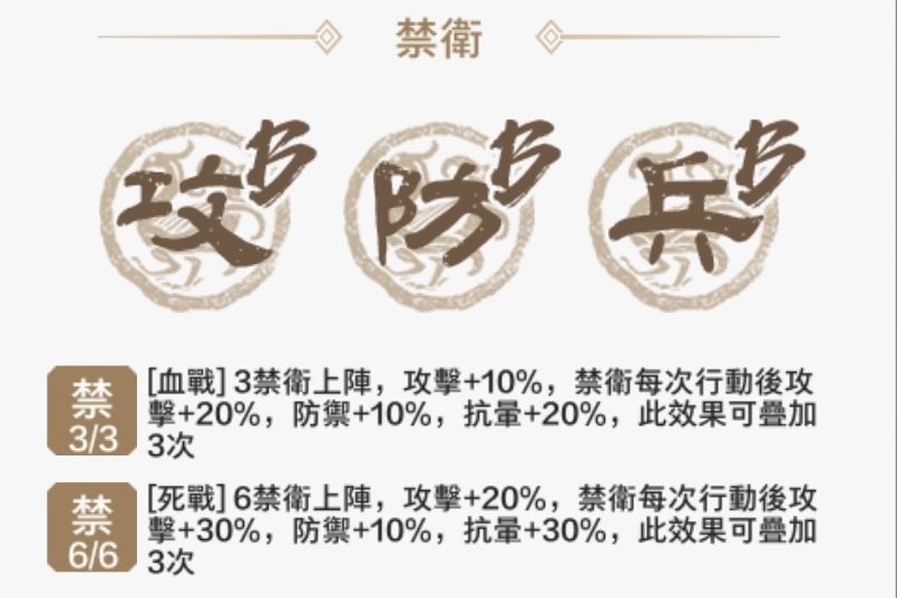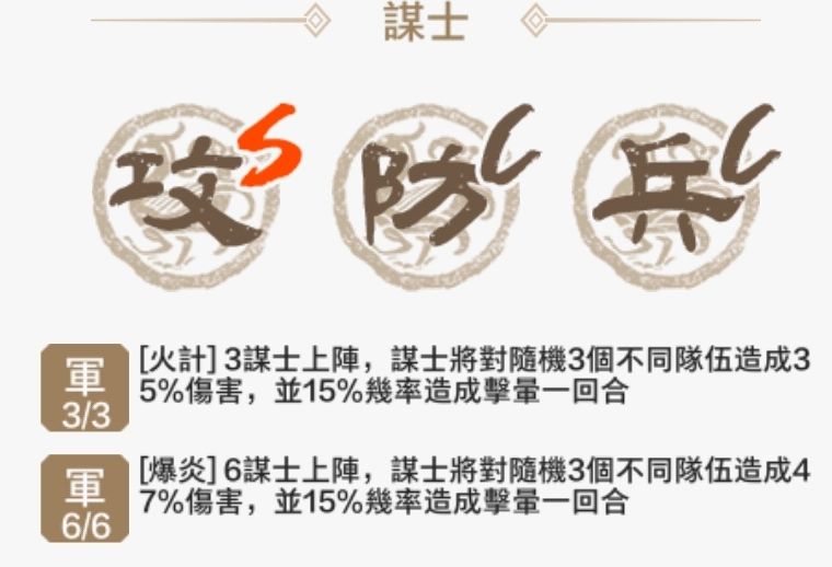 攻擊一般。防禦/血量卓越。多配謀士/方士/禁衛。